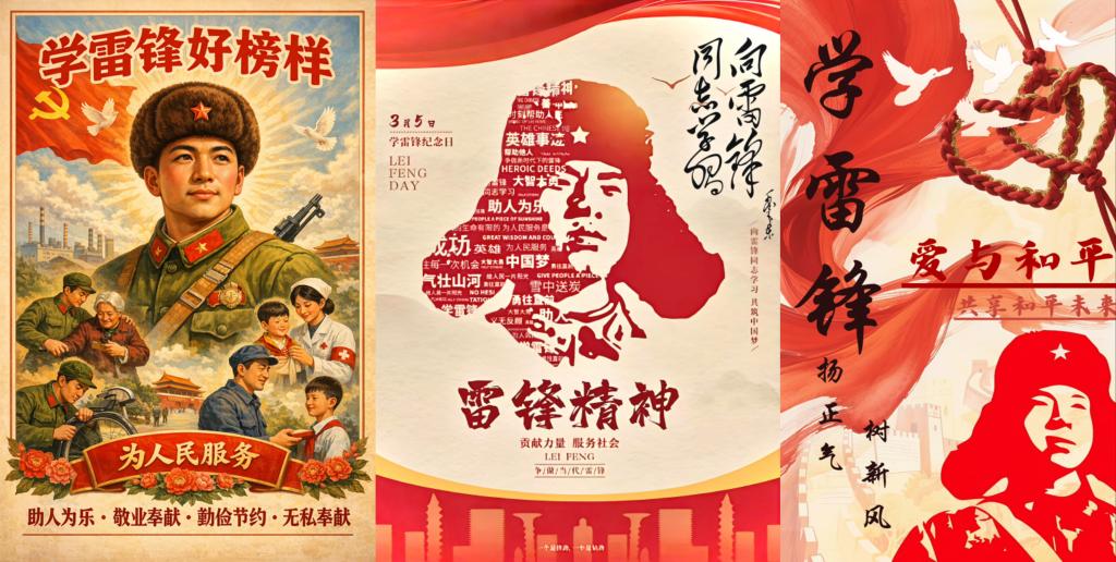 学院立足专业特色,创新雷锋精神传播形式,开展“AI 绘雷锋”主题活动。活动以AI创作工具为载体,引导学生将对雷锋精神的理解融入创意海报设计,作品涵盖复古宣传画、像素剪影、水墨风格、文字云等多元形式,用数字艺术赋能红色文化传播,展现了当代青年以专业能力践行雷锋精神的青春风貌。本次活动实现了“专业实践+思政育人”的深度融合,让雷锋精神在数字时代焕发新生,进一步推动雷锋精神在青年学子心中落地生根。