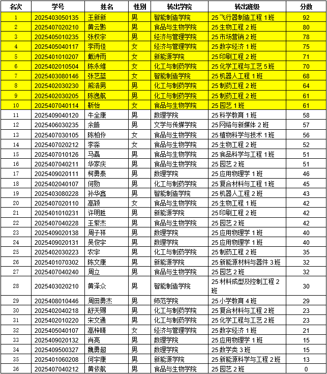 按照“qy球友会2025-2026学年学生转专业工作方案”,以下十名同学进入面试: