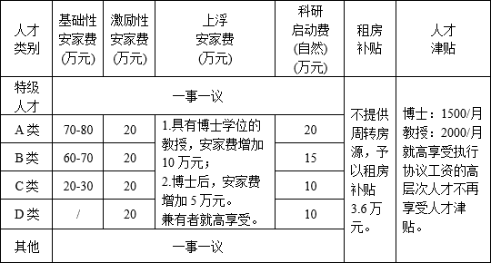 国内外杰出人才、领军人才及学术骨干,待遇、安家费和科研启动费实行“一人一议,一人一策”。